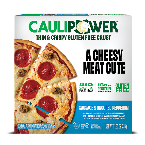 Crust (Cauliflower, Brown Rice Flour, Rice Flour, Water, Corn Starch, Tapioca Starch, Sunflower Oil, Parmesan Cheese [Pasteurized Milk, Cheese Culture, Salt, Enzymes], Stabilized Rice Bran, Baking Powder [Sodium Acid Pyrophosphate, Sodium Bicarbonate, Corn Starch, Monocalcium Phosphate], Xanthan Gum, Sugar, Sea Salt, Vinegar, Basil, Oregano, Rosemary), Low Moisture Part Skim Mozzarella Cheese (Pasteurized Part Skim Milk, Cheese Culture, Salt, Enzymes), Sauce (Tomato Puree [Water, Tomato Paste], Sugar, Sea Salt, Garlic Powder, Onion Powder, Lemon Juice, Oregano, Basil, Crushed Red Pepper), All-Natural* Uncured† Pepperoni (Pork, Beef, Sea Salt, Natural Flavors, Cultured Celery Juice, Dextrose, Spices, Extractives of Paprika, Cherry Powder, Lactic Acid Starter Culture), Italian Sausage (Pork, Spices, Salt, Sugar, Natural Flavorings, Dehydrated Garlic). Contains: Milk