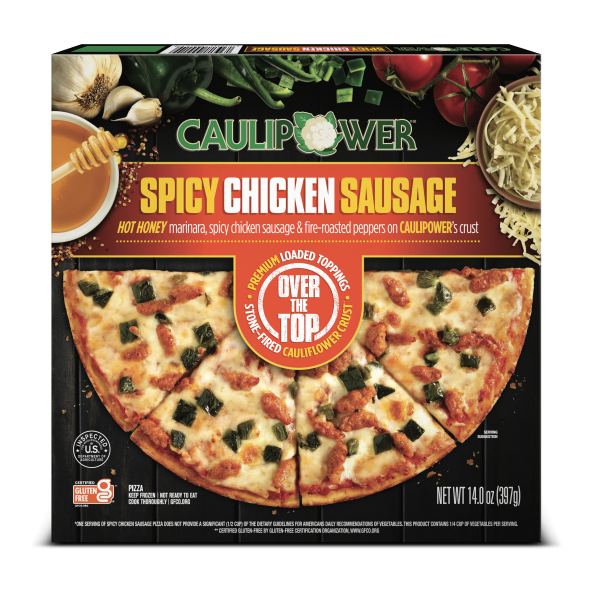 Crust (Cauliflower, Brown Rice Flour, White Rice Flour, Water, Corn Starch, Tapioca Starch, Vegetable Oil [Contains One Or More Of The Following: Canola Oil, Sunflower Oil, Olive Oil], Egg, Baking Powder [Sodium Acid Pyrophosphate, Sodium Bicarbonate, Corn Starch, Monocalcium Phosphate], Xanthan Gum, Sugar, Yeast, Vinegar, Salt), Sauce (Water, Seasoning [Sugar, Cane Sugar, Corn Starch, Maltodextrin, Spice, Honey, Less than 2% Garlic Powder, White Distilled Vinegar, Salt, Fully Refined Soybean Oil], Tomato Paste), Low Moisture Part Skim Mozzarella Cheese (Pasteurized Part Skim Milk, Cheese Cultures, Salt, Enzymes), Cooked Chicken Sausage (Chicken Thigh Meat, Water, Spices, Salt, Tomato Paste [Tomato Paste, Salt, Citric Acid], Garlic, Spray-Dried Baker's Yeast [Baker's Yeast Extract, Salt, Canola Oil, Natural Smoke Flavor], Onions, Sugar, Dehydrated Garlic, Smoked Paprika, Natural Flavorings), Fire Roasted Pepper.