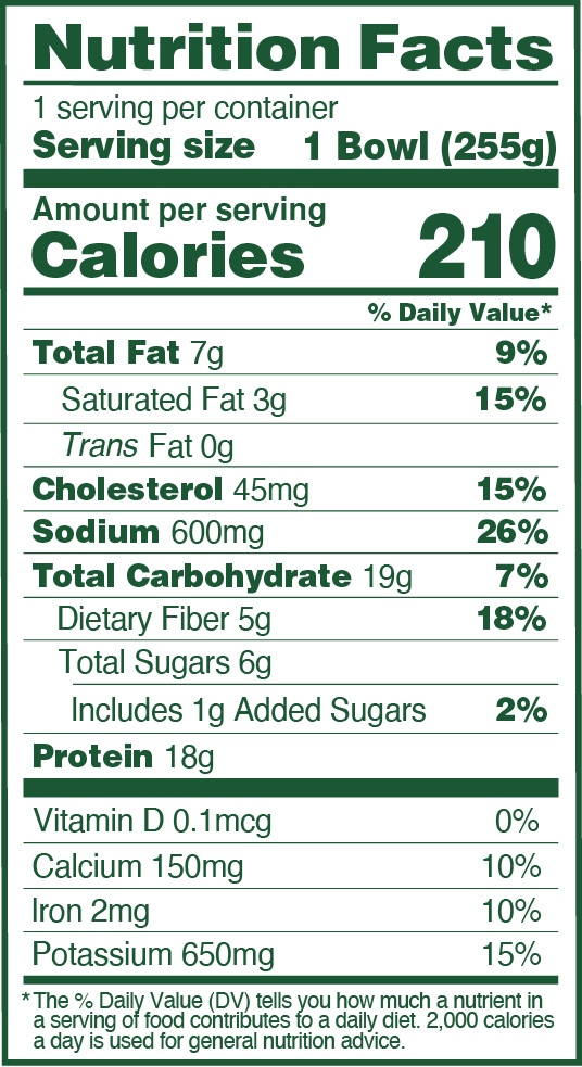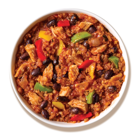 Riced Cauliflower, Cooked Seasoned Chicken Breast with Rib Meat (Boneless, Skinless Chicken Breast with Rib Meat, Water, Potato Starch, Vinegar, Yeast Extract, Salt, Citrus Extract), Tomatoes (Tomatoes, Tomato Juice, Citric Acid), Red, Green And Yellow Bell Pepper, Black Beans, Onion, Cheddar Cheese (Pasteurized Cultured Milk, Salt, Enzymes, Annatto [Color]), Monterey Jack Cheese (Pasteurized Cultured Milk, Salt, Enzymes), Water, Tomato Paste, Roasted Poblano Pepper, Chipotle Puree (Chipotle Pepper, Water, Salt, Vinegar), Cilantro, Guajillo Pepper Puree (Water, Guajillo Pepper), Garlic (Garlic, Water), Canola Oil, Tapioca Starch, Cane Sugar, Spices, Sea Salt, Lime Juice Concentrate, Smoked Paprika. Contains: Milk